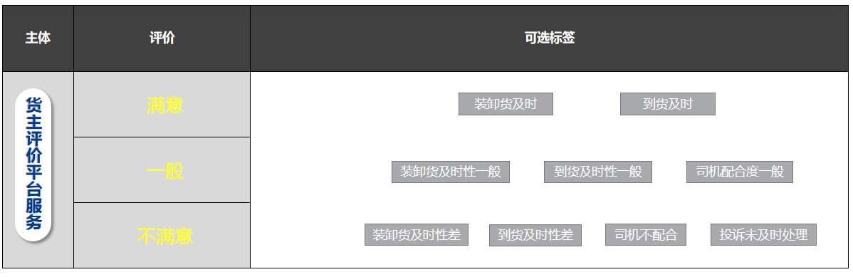 评价内容:满意,一般,不满意,将在运单列表中显示,并由平台客服依据该评分对司机进行评价。